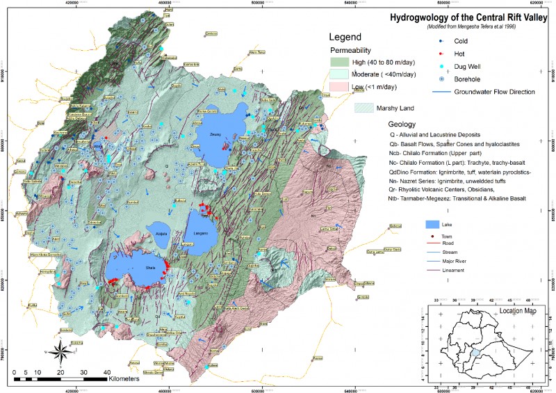 Figure 1: Hydrogeological map of CRV showing the geology, permeability and the NE-SW oriented fault swarms controlling groundwater flows
