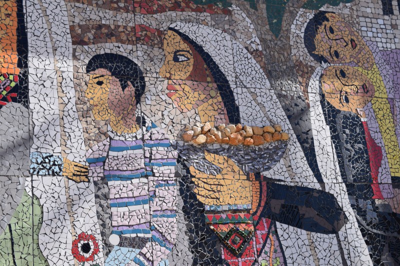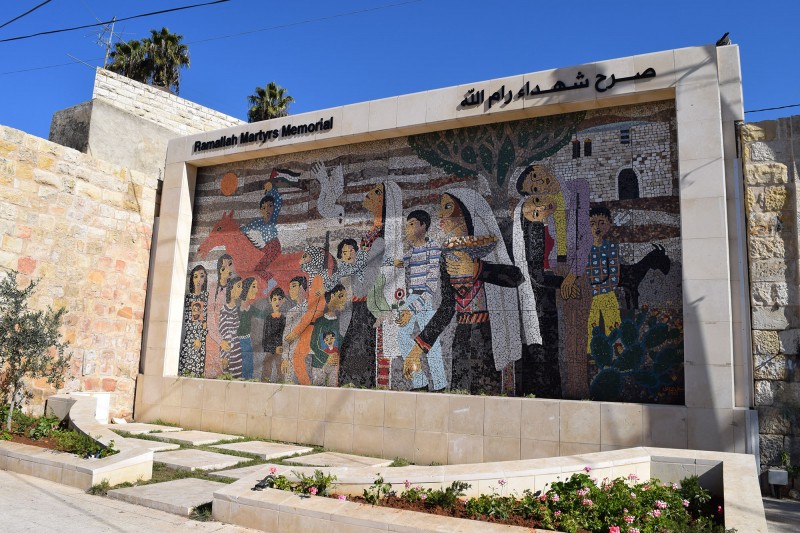 A mosaic memorial to martyrs of the Palestinian cause - Ramallah. This includes visual signifiers such as the Sabra cactus, women and children holding pictures of martyred young men, olive trees and a dove.