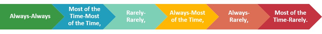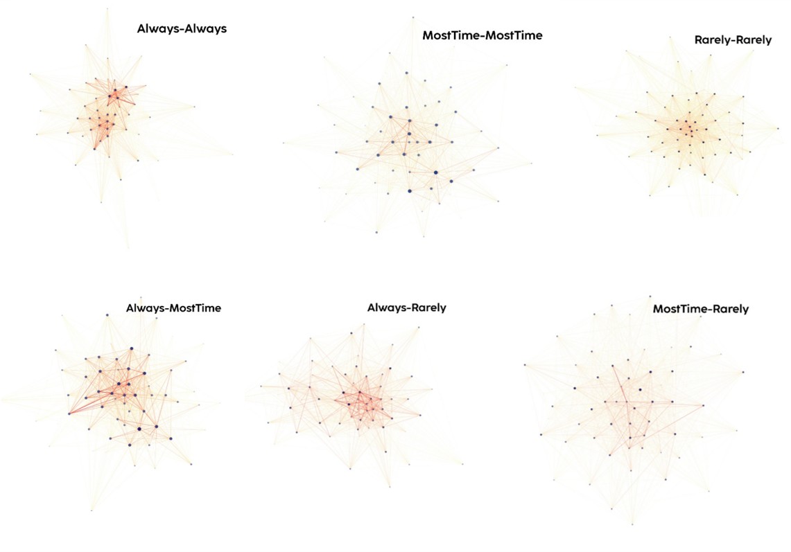 Considering that practice is defined as a network of interconnected elements, it is important to highlight that the Fuzzy Logic calculation of SSPI is focused mainly on elements (nodes) in relation to their recurrence. With this in mind, as well as the nodes, links are an essential part of the networks. To visualise and calculate the properties of the assemblies, we explored network diagramming and analysis. In this stage, we realised that we had multiple levels of recurrence, this means that each node could have three different positions: Always, Most of the Time and Rarely, and it could be linked with the other elements of those three categories. In this sense, it is possible to identify 6 networks (as shown under).
