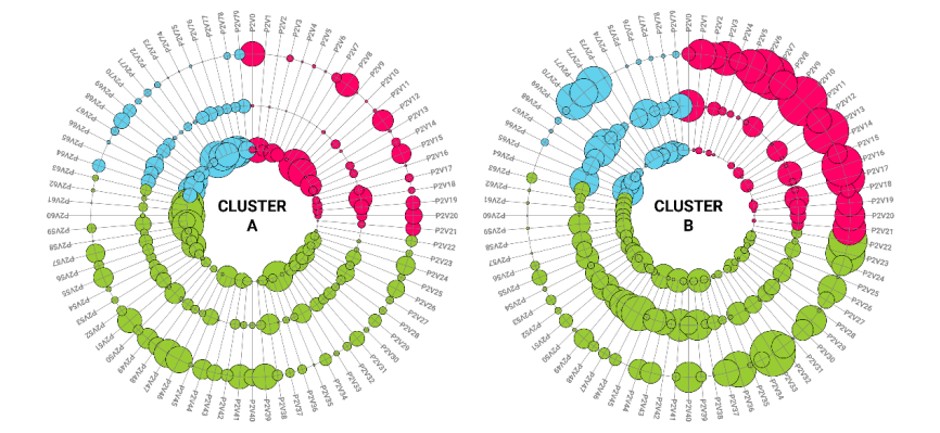 Following the work of Medd and Shove, 2006 and Pullinger et al., 2013, a k-means clustering technique has been applied to identify widely shared “versions” of a practice. This was first done using data from a Pilot Test, to ensure its workings. Identified clusters were plotted using Rings of Recurrence radial graphs, developed and programmed by the project’s researchers. This tool helps visualise the differences between various practices, as shown in Rings of recurrence radial graphs.