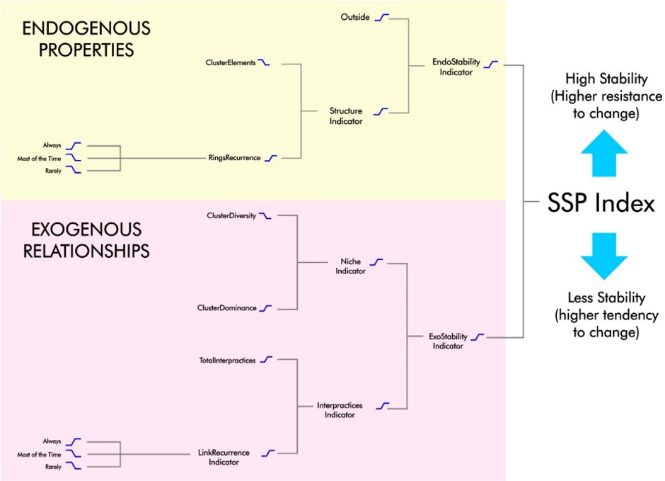 Shove et al. (2012) highlighted the need for a dynamic index of social transformations in practices, to see how practices have changed over time. Using this outlook, for this study it is important to know how stable, fixed, and/or resistant to change the water-use practices we surveyed are. To calculate the degree of stability of a cluster of practice a Social Stability of Practice Index is proposed. Fuzzy Logic was selected as the software to integrate the multiple data inputs, which are categorised into Endogenous Properties (the isolated cluster) and Exogenous Relationships (the cluster and its household environment).